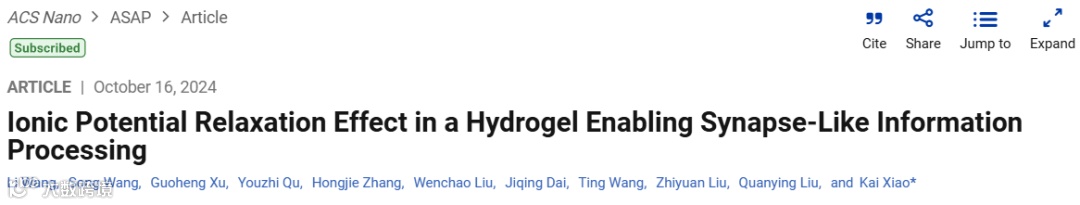 近日,南方科技大学生物医学工程系的肖凯课题组提出了一种利用水凝胶中的离子电势弛豫效应实现突触功能模拟的新策略,相关工作以题为“Ionic Potential Relaxation Effect in a Hydrogel Enabling Synapse-Like Information Processing”的文章发表在了学术期刊ACS Nano上。人类大脑包含约1015个突触,它们同时负责信息的存储与计算,是大脑处理信息的核心部件。生物突触通过突触后膜介导的离子选择性跨膜传输来调节膜电位(突触权重),进而实现存算功能。这一生物学基础启发了以离子为信息载体的人工突触器件的发展,旨在构建低能耗、高效率、生物兼容的类脑智能系统和无缝的人-机交互界面。柔软且生物相容的离子导电水凝胶是构建该类器件的理想基材,但如何调控水凝胶中的离子传输行为以模拟突触后膜电信号仍是一项巨大挑战。在本研究中,他们提出了一种存在于水凝胶器件中的离子势弛豫效应,用于模拟和突触功能相关的特征离子电信号,如双脉冲易化/抑制(PPF/PPD)、长时程增强/抑制(LTP/LTD)和脉冲时序依赖可塑性等,并实现类突触的信息处理功能,包括信息存储、经验学习、感知和计算等。器件的结构、弛豫机理和具体的实验结果如下: