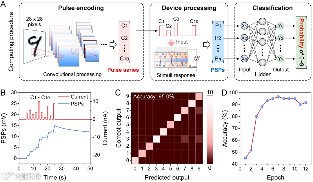 图4. P-A80M20用于神经形态计算—手写数字分类。(A)计算流程。(B)随机数字“0”对应的编码序列以及响应信号。(C)分类结果,显示准确率高达95%。(D)准确率与训练轮次的关系。