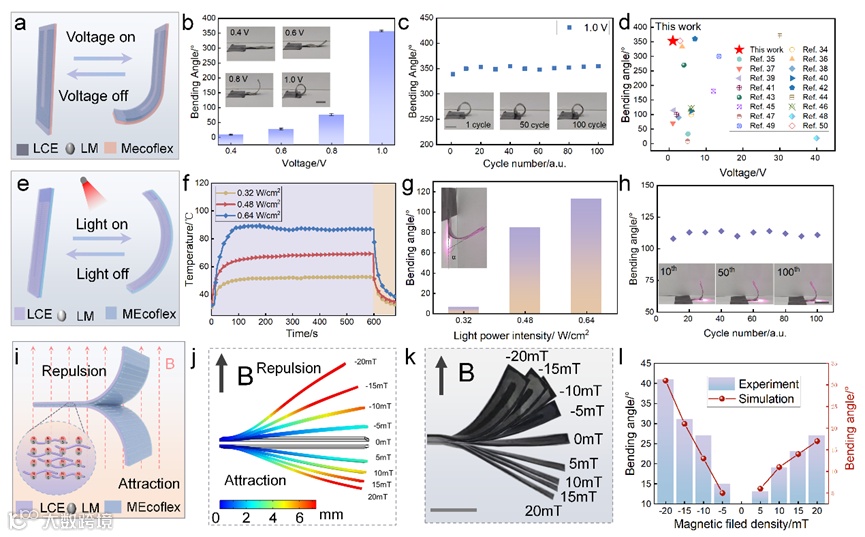 在热膨胀系数差异产生的变形失配和LCE中液晶分子的相变变形协同作用下,LCE/LM/Mecoflex驱动器展现了良好的电/光驱动器性能(图2a-h),驱动器在1.0 V 驱动电压下产生357°的大变形。由于钕铁硼颗粒的硬磁特性,LCE/LM/Mecoflex 驱动器具有可编程的驱动性能(图2i-l)。