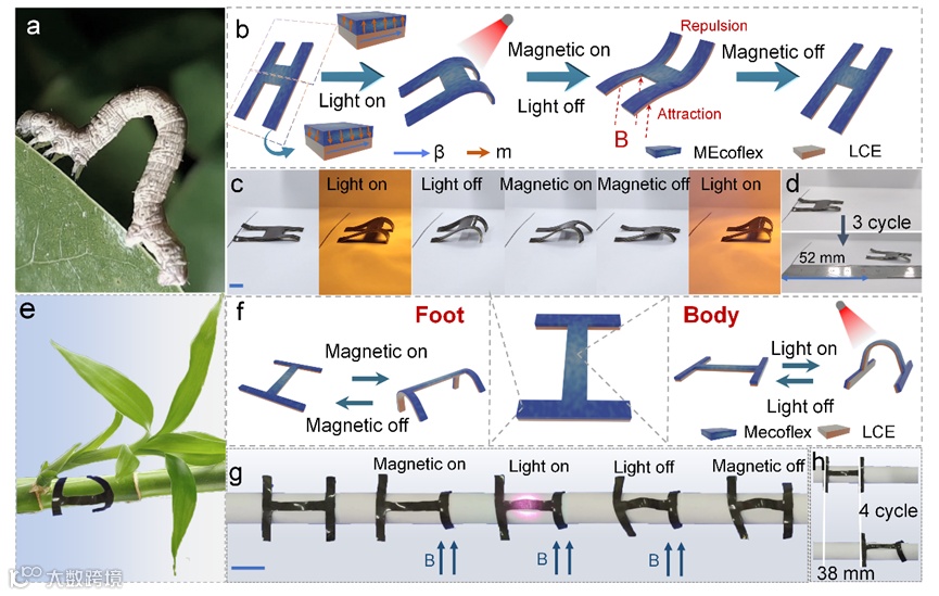最后,由于LCE/LM/Mecoflex 执行器具有可编程的双各向异性和多响应性,可用于设计环境适应性仿生四足机器人,实现类似于尺蠖的爬行运动。通过对 “工”字结构的四足机器人进行结构设计,实现其在平面和曲面的爬行(图6)。