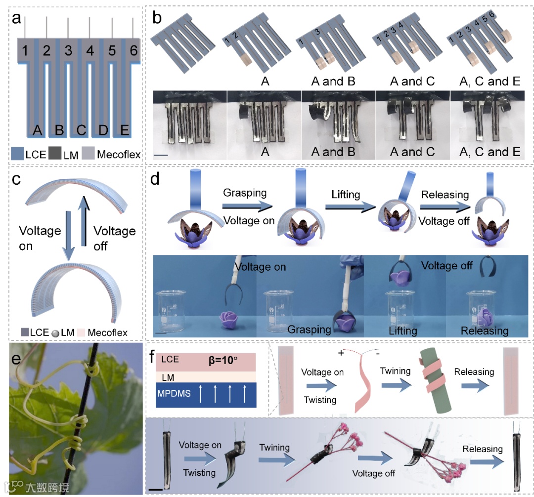 基于LCE/LM/Mecoflex驱动器良好的电热驱动性能,通过对LM通路的设计可以实现驱动器的顺序性和选择性驱动,并进一步开发智能抓手和仿生攀援植物实现对规则的花束的抓取和缠绕(图5)。