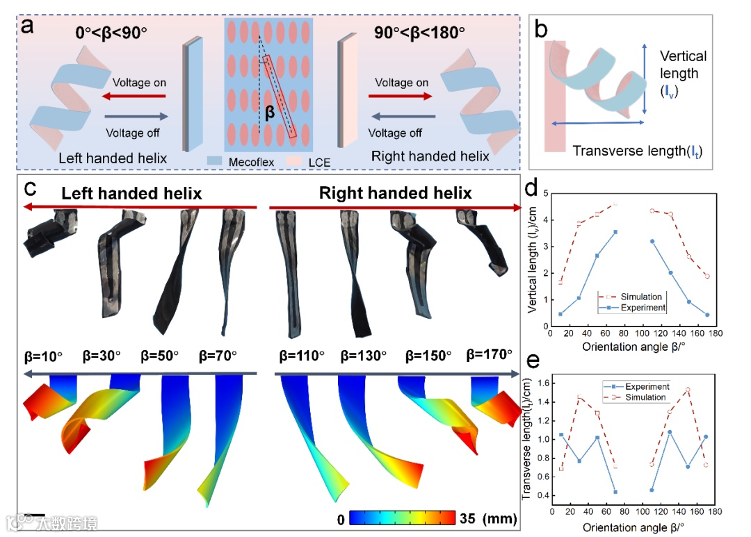 通过定制LCE 层的液晶分子取向,设计了仿生攀援驱动器,在电/光刺激下产生螺旋弯曲变形,其中取向角 β 被定义为 LCE 中的取向方向与薄膜长轴之间的夹角(图 3a)。当取向角 0°<β<90° 时,驱动器向左产生螺旋弯曲变形。当取向角 90°<β<180° 时,驱动器向右产生螺旋弯曲变形。