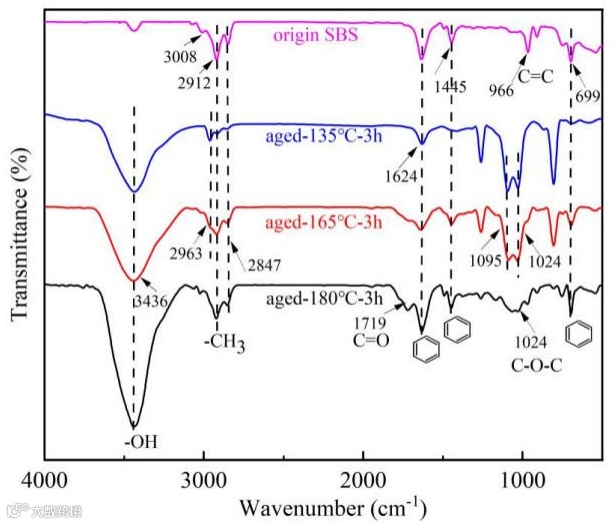 图4为线型SBS在不同温度下老化3 h的红外图。未老化前,可发现966 cm-1处丁二烯的C=C峰和699 cm-1处苯环的C-H振动峰,经过不同温度老化后,C=C振动峰消失,而苯环的C-H峰存在,说明丁二烯的热稳定性比苯乙烯的弱,在受到高温和氧气的作用下更容易发生破坏。经不同温度老化后,1095 cm-1和1024 cm-1处发现了醚键峰,180 ℃的老化温度下,1719 cm-1处出现羰基取代峰,这说明了老化产物的产生。老化产物中产生了羟基和羧基,因此3436 cm-1处-OH峰的响应较强。红外说明在高温作用下,不饱和的C=C会发生均裂,形成链自由基,C原子在高温环境下更容易得到两个电子,在氧气的作用下形成羰基。此外,有氧环境中,链自由基会捕捉氧原子在原位反应生成过氧化物或环氧化物,进一步在高温作用下生成含有醛、醇、羧基等基团的氧化产物。