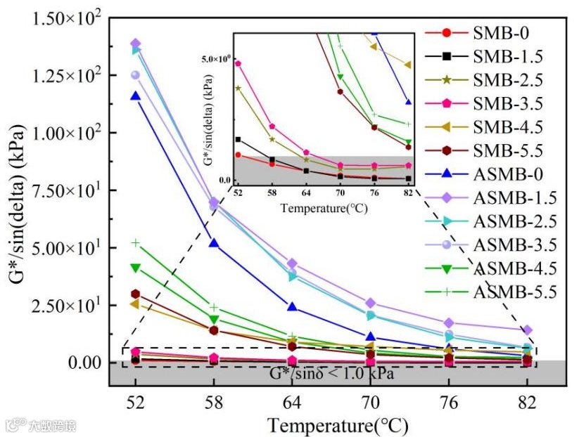 此外,对不同SMB随温度变化的抗车辙因子也进行了分析,如图8所示。该因素是评价沥青在高温下的耐车辙能力的指标。随着温度的升高,SBS改性沥青的G*/sinδ值下降。因为当温度升高时,沥青会逐渐变软。沥青从固体状态转变为粘性状态。当车辙因子为1.0 kPa时,SMB-0,SMB-1.5,SMB-2.5和SMB-3.5对应的温度分别为:52.36 ℃,57.02 ℃,62.95 ℃和65.81 ℃,当SBS含量大于4.5 wt%时,对应温度大于82 ℃ 。随着SBS含量的增加,温度升高,这意味着SBS含量的提高对改善沥青的高温车辙能力具有积极作用。