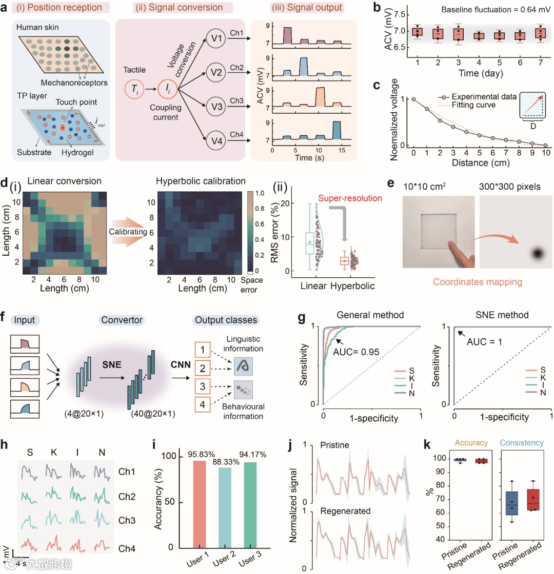 基于功能导向设计思路,水凝胶网络被分化制造成两层功能传感层:触摸定位层(TP层)和压力感知层(PS层)。TP层由热诱导聚合水凝胶制造。热诱导聚合水凝胶具有高强度、高稳定性和低电信号漂移特性,从而更适用于机器人皮肤的触摸定位层。作者采用四电极结构,结合位置矫正算法,实现了大面积、全区域的高精度触摸定位(图3a-c)。基于超快响应(<10ms)和超低误差(均方误差低于3%)的触摸定位板展示了高精度触摸定位、普适性手写识别等功能(图3d-i)。在回收复用制造后,传感信号以及识别功能仍然保持(图3j-k)。