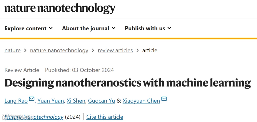 2024年10月3日,深圳湾实验室饶浪/新加坡国立大学陈小元等在《自然:纳米技术》(Nature Nanotechnology)杂志在线发表了题为“机器学习辅助纳米诊疗”(Designing nanotheranostics with machine learning)的综述论文(图1),回顾了纳米诊疗领域的最新研究进展,详细阐述了纳米诊疗所面临的挑战,并深入探讨了ML为该领域的发展所带来的机遇,有望为纳米诊疗领域的发展提供思考借鉴。
