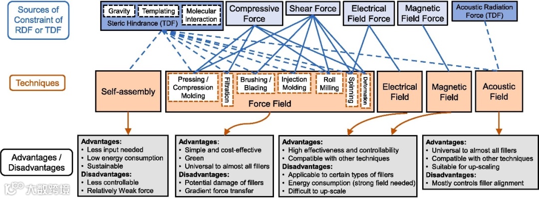 图4:在典型的复合材料制造技术中,限制填料转动自由度(实线)和平动自由度(虚线)的主要来源,以及各类制造技术的优缺点。