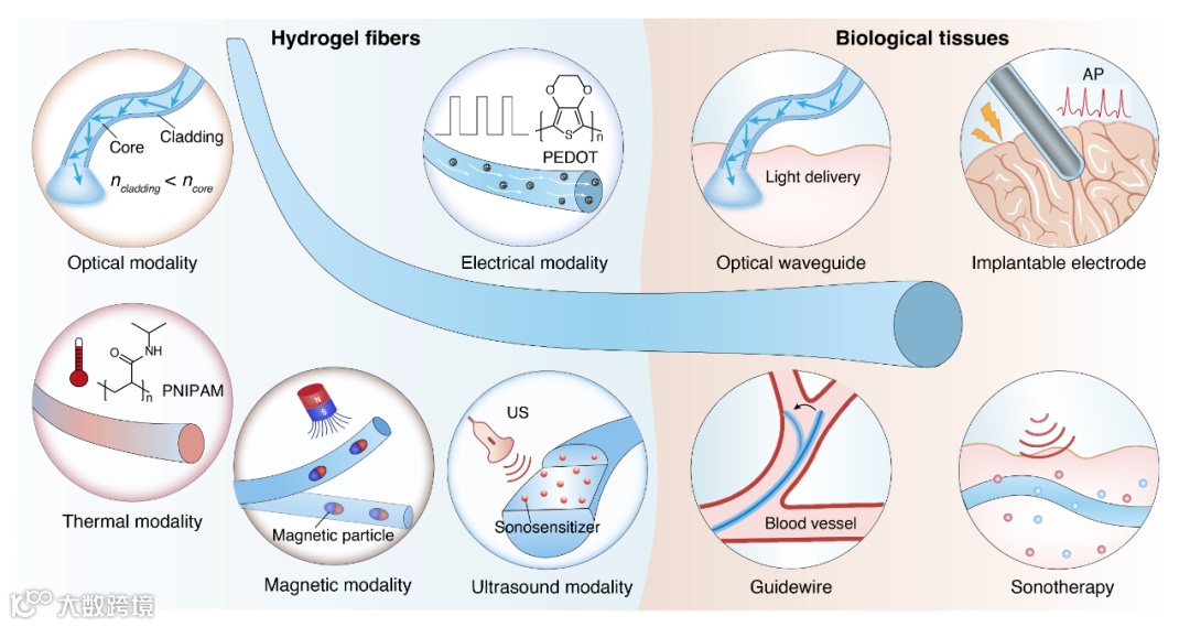 图1 生物界面用水凝胶纤维。功能性水凝胶纤维的特征示意图(如,导光,导电,热响应性,磁响应性和超声波响应性)用于各种生物界面应用(如,光传导,可植入电极,导丝和超声治疗)