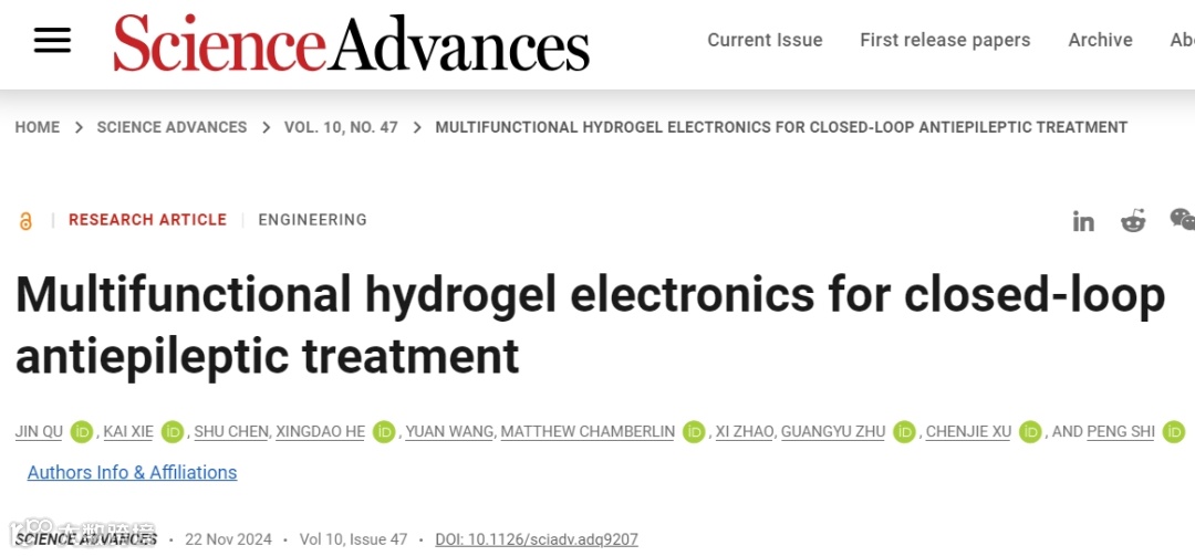 “水凝胶生物电子设备不仅在抗癫痫干预中展示了更好的治疗效果,还减少了因过度用药引起的潜在药物副作用。随着更多人工智能(AI)组件的加入,反馈信号也可以进一步细化,更好地分析或预测患者的生理状况,从而更智能地参与治疗干预。我们相信,这种闭环系统为下一代智能神经治疗提供了一种有前途的替代方案。”史鹏教授评价道。