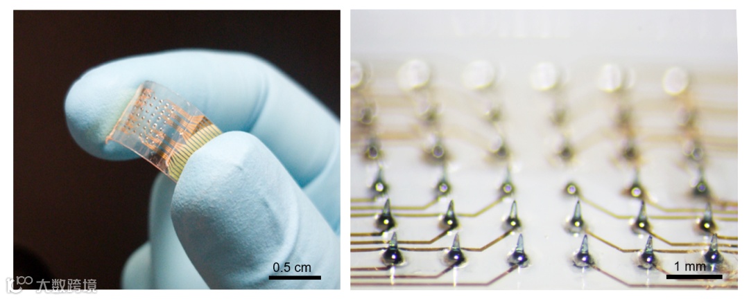 (图)柔性水凝胶生物电子设备的概览照片(左)和特写照片(右)。