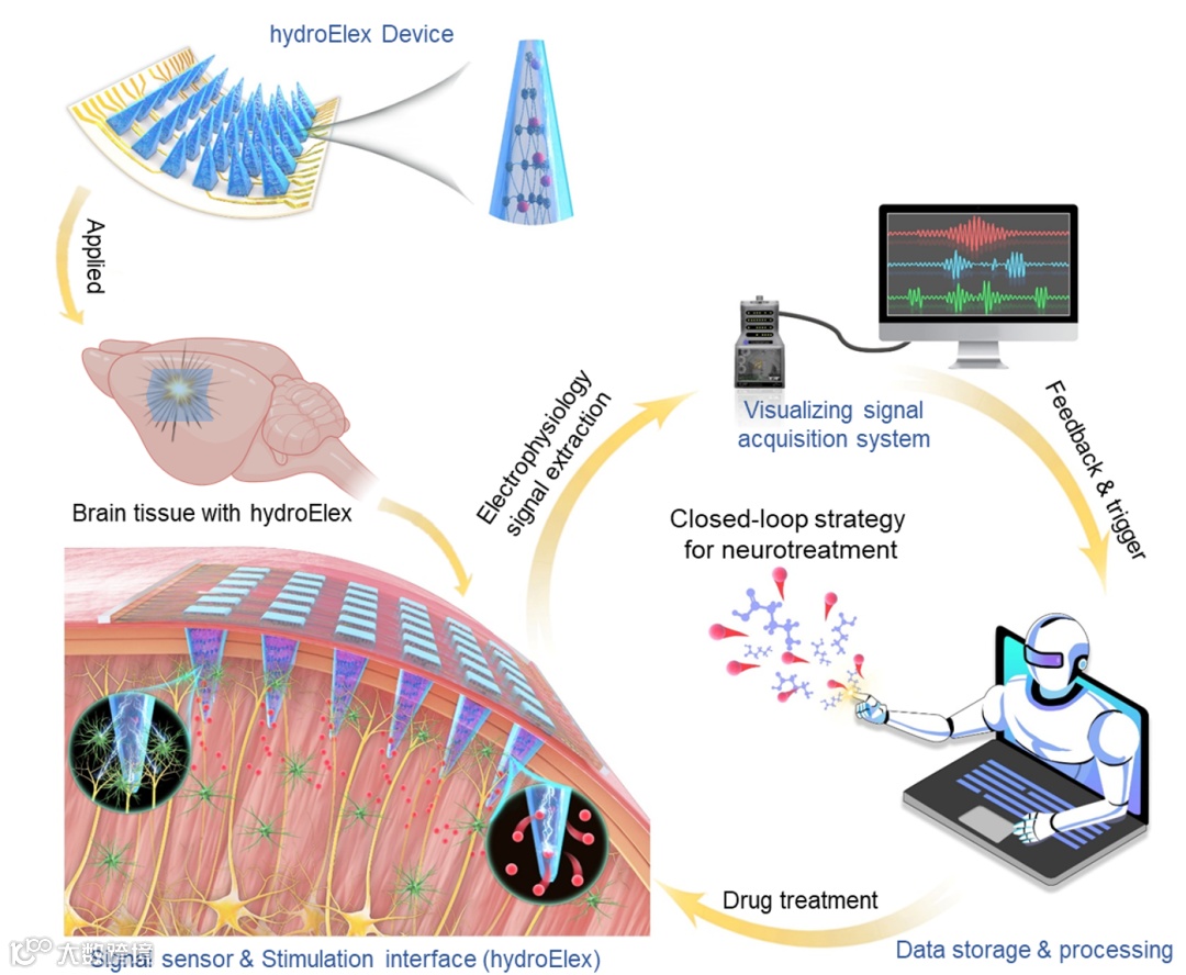 香港城市大学(CityUHK)生物医学工程系史鹏教授课题组报道了一种基于水凝胶电子设备的闭环系统,旨在构建智能化的大脑疾病治疗策略。在智能治疗系统中,药物可以被精准控制从而为病患定制个性化的治疗方案。通过集成闭环组件,希望能够持续监测患者的疾病状态并相应地调整治疗策略,从而实现最佳的治疗效果。作为应用实例,该课题组利用基于水凝胶电子器件的闭环系统,将电生理记录和可编程的药物释放干预无缝衔接,实现精准化的抗癫痫管理。