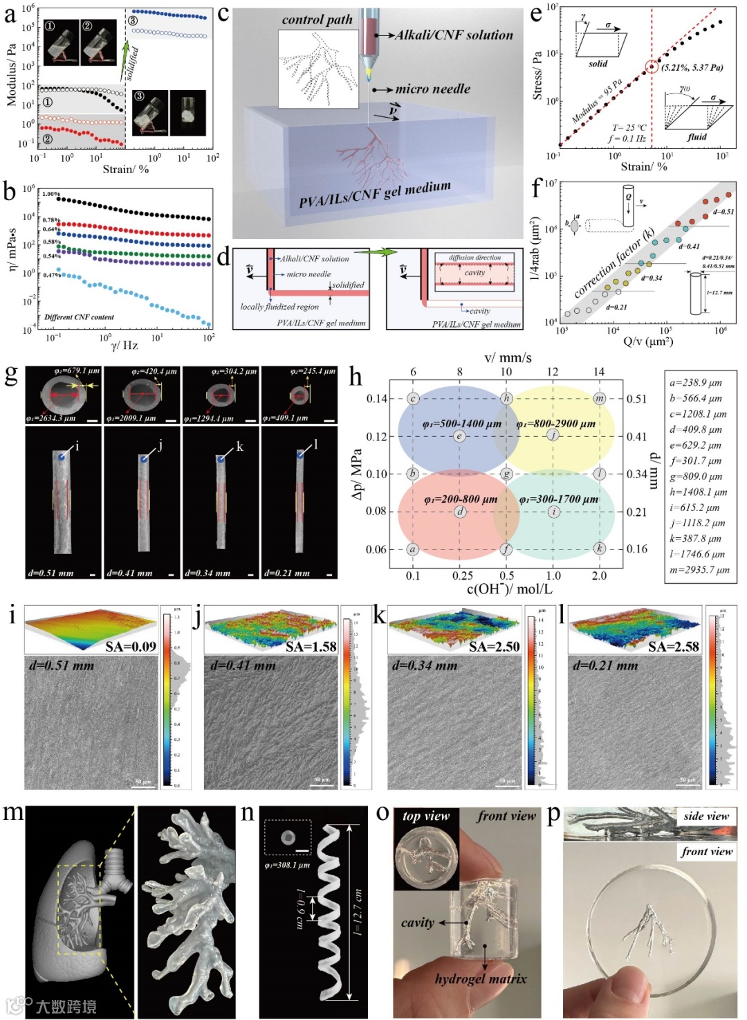 通过简单、通用的方法快速构筑具有任意结构复杂性和可控直径的管状水凝胶结构长期以来面临着巨大的挑战。近期,烟台先进材料与绿色制造山东省实验室(简称黄渤海实验室)精密制造材料与技术团队受蜘蛛丝变性能力的启发,提出了一种通过高浓度碱诱导聚乙烯醇/离子液体(PVA/ILs)溶液络合而实现快速凝胶化的新策略,即碱诱导分子聚集(AMA)以应对挑战。该策略能快速制造出直径可调、厚度可控、拉伸强度高达1.1MPa、断裂伸长率超过600%的管状水凝胶结构。如图1所示,与蜘蛛丝的流动诱导结晶实现快速液-固转变类似,通过碱诱导PVA分子链羟基的去质子化并与离子液体中阳离子的络合而实现快速凝胶化。分子动力学模拟表明,体系中的相变发生在0.5 ns以内。更为重要的是,两种溶液的扩散具有方向性,即总是从碱扩散向PVA/ILs中,这种特殊的具有方向性的扩散使其能较易的通过挤出式3D打印制造腔体结构,为简单快速制造管状水凝胶结构提供了巨大的潜力。