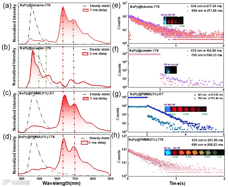 首先,研究了NaPy 在甲苯溶液(20 μM,77 K)中的光物理特性,肉眼可清晰地观察到红色超长磷光,并持续 1.0 s,延迟磷光光谱显示在634 nm 和698 nm 处有两条超长磷光带,寿命分别为 277.59 ms 和 277.86 ms,与红色余辉一致。随后,以1%的质量比将NaPy掺杂到PMMA中,发现NaPy@PMMA膜在室温下发出了持续时间为 0.85 s的红色超长磷光;但在77 K时,它显示出独特的时间依赖的余辉颜色变化,从红色变为黄色,再进一步变为绿色,并且这种多彩的余辉持续了4.5 s。为了进一步确认绿色磷光成分的归属,他们研究了二萘胺在PMMA薄膜和纯粉末状态下的磷光行为,经过对比分析,将520 nm 和 550 nm 处两条磷光带归于NaPy的二萘胺分子是合理的。