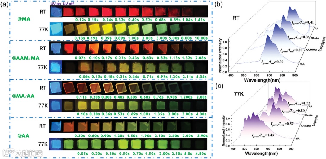 由于共聚薄膜比掺杂薄膜能够提供更为致密的刚性环境,可有助于实现NaPy在室温下时间依赖的余辉变色。在紫外光下,NaPy@MMA膜呈蓝色发光(图 3)。紫外光关闭后,肉眼可观察到随时间变化的彩色余辉。在0.23 s之前,余辉为红色,表明芘单元占主导地位。从0.23 s到1.19 s,余辉颜色变为黄色,表明芘单元和二萘胺分子之间相互配合。当时间超过1.45 s时,余辉颜色最终变为绿色,表明二萘胺分子占主导地位。在室温下,共聚 MMA 薄膜的刚性较高,可以有效激活二萘胺和芘单元的本征超长磷光,而NaPy@PMMA薄膜由于刚性较低,只能表达芘单元的红色余辉。此外,这两条磷光带的寿命分别为551.2 ms(550 nm)和378.0 ms(650 nm),表明红色磷光成分的衰减速度远远快于绿色磷光成分,这与余辉颜色从红色到黄色再到绿色的时间依赖变化非常吻合。此外,他们还在10 ms~25 ms 范围内改变了延迟磷光光谱的延迟时间。随着延迟时间的增加,红色磷光成分的相对强度明显下降,这与随时间变化的余辉颜色变化趋势一致。此外,CIE 坐标也能准确监测不同延迟时间下的余辉颜色变化过程。此外,还对不同的发射峰进行了激发光谱分析。结果表明,520 nm 和 560 nm 处的磷光带(绿色磷光成分)具有相似的激发光谱,而610 nm 和661 nm处的磷光带(红色磷光成分)的激发光谱几乎相同,进一步证明绿色磷光成分和红色磷光成分分别来自二萘胺分子和芘单元。与室温不同的是,在 77 K时绿色磷光的相对强度增强,导致余辉变色过程出现微小差异。因此,NaPy时间依赖的余辉颜色变化取决于两个因素:双磷光组分的相对强度变化和它们的不同寿命,这两个因素是由基质刚性和温度决定的。