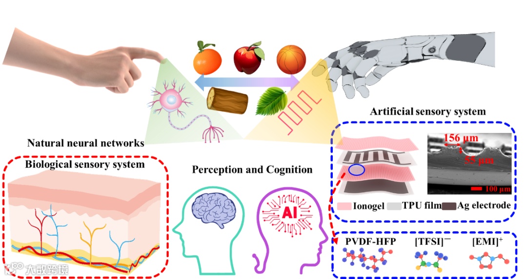 图1. 一种模仿人类生物感觉系统的人工感觉系统,用于识别材料类型、粗糙度和接触压力。
