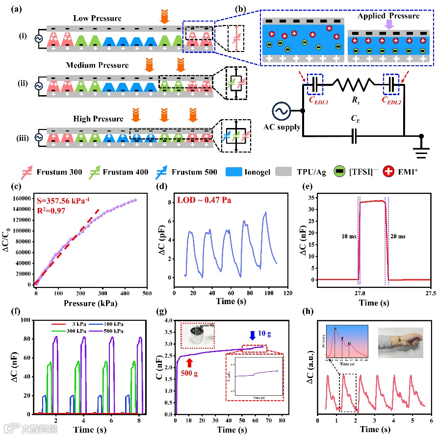 图2. 梯度微锥型离子凝胶结构设计、传感原理及传感性能展示