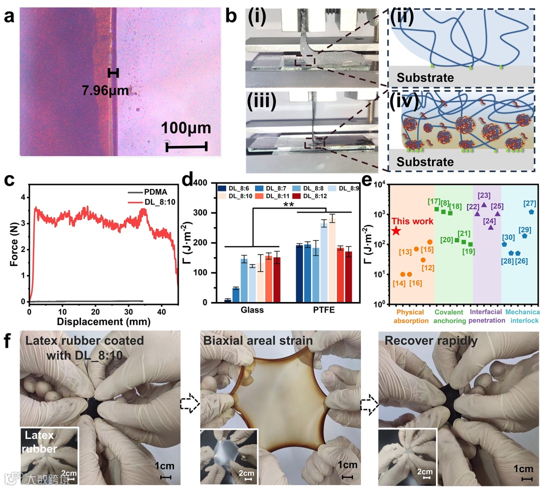 水凝胶涂层是将基材与水凝胶功能性表面相结合的关键策略。然而,水凝胶涂层往往与基材表面存在粘附能低的问题限制了其应用。为了提高水凝胶与基材的界面结合力,目前主要策略是通过与基材表面形成共价键或互穿结构,但这些策略往往涉及较复杂的涂层工艺,如表面修饰、水凝胶原位聚合、交联等。这种复杂的涂覆工艺在一定程度上限制了其通用性。因此,开发一种涂施简单、涂施过程不涉及水凝胶单体聚合的,可以克服水的干扰、与各类材料表面均具有较强粘附力的水凝胶涂层仍面临挑战。