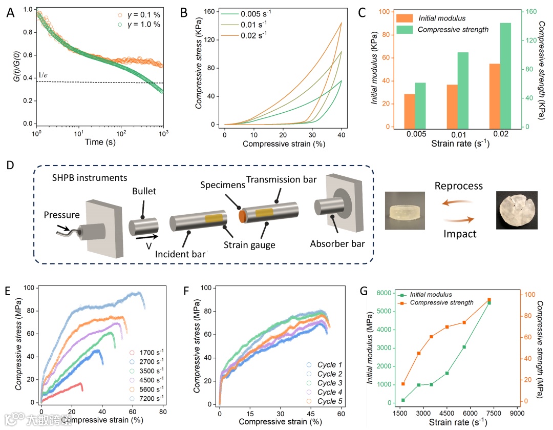 具体地,以亚纳米尺度的寡聚笼型倍半硅氧烷颗粒(CPOSS)和低分子量的超支化聚乙烯亚胺(PEI)为构筑基元,通过静电/氢键相互作用构建了的分子颗粒材料。其具有高交联密度的物理网络,赋予了材料良好的强度和韧性(图1a)。简单调节CPOSS和PEI比例可以实现分子颗粒材料物理性质的广泛调节,包括粘弹性,自修复性和加工性,为分子颗粒材料在不同应用场景下使用提供了可能(图1b)。小角X光散射表明,CPOSS含量的增加会促进亚纳米颗粒产生超分子多层级聚集,这能为分子颗粒材料提供多种能力耗散方式:包括CPOSS颗粒的快速松弛以及CPOSS聚集微相区的协同运动和变形等(图1c和1d)。