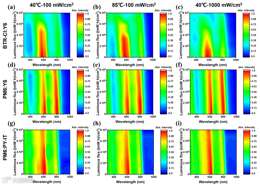 在相同的累积辐射通量、低光强条件下,含有聚合物组分(PM6:Y6和PM6:PY-IT)的活性层薄膜中的聚合物链具有较长的运动和松弛时间,导致光照后薄膜性能相对较差。同时,在全小分子薄膜中(BTR-Cl:Y6),由于聚合物链不存在缠结和锁存现象,小分子在外加能量作用下运动更剧烈,在强光下降解更快。