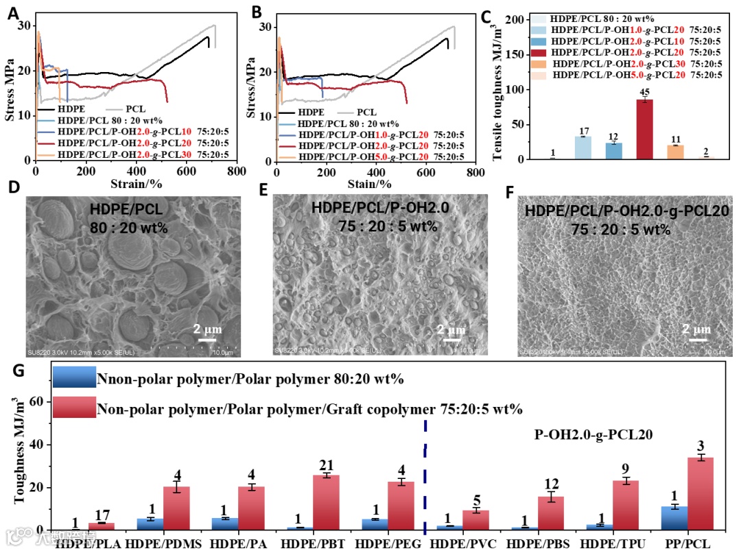 随后,作者使用这些新型的接枝共聚物来进行混合塑料的回收研究。使用双螺杆挤出机,在非极性聚合物与极性聚合物共混体系中加入新型的接枝共聚物,并研究了共混物的拉伸性能和断面的电镜图(图3)。以HDPE和PCL共混体系为例(质量比= 80:20),加入5 wt%的接枝共聚物后拉伸韧性均显著提高,具有不同支链密度和长度的接枝共聚物表现出不同的增容能力,其中接枝共聚物P-OH2.0-g-PCL20可提高韧性至对照组的45倍。扫描电子显微镜(SEM)也证明加入5 wt%的接枝共聚物P-OH2.0-g-PCL20展现出更好的相容性。此外,接枝共聚物P-OH2.0-g-PCL20还改善了商业聚烯烃材料(HPDE或PP)与许多其他广泛使用的极性聚合物(PVC、PBT、TPU等)之间的相容性。