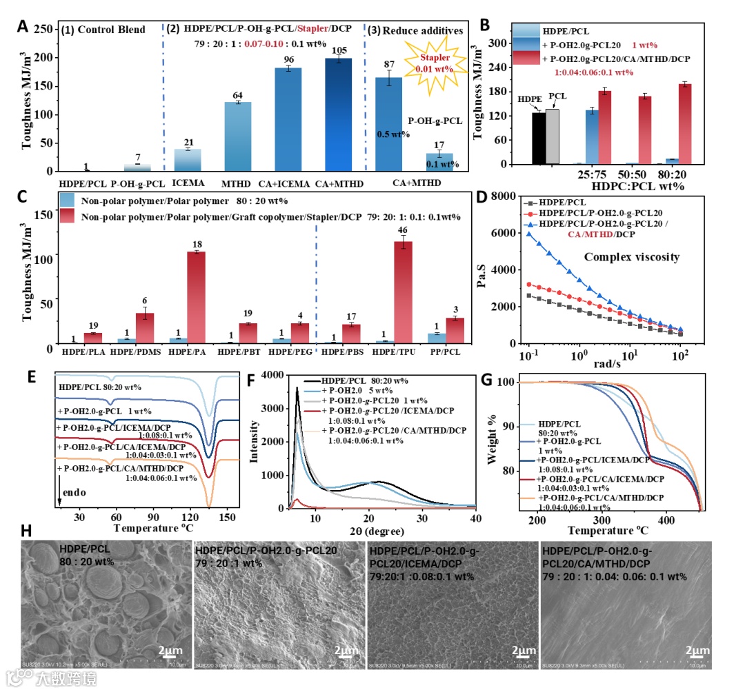 受上述订书机策略高效增容能力的启发,作者进一步增加订书机小分子的反应位点,发展了多臂订书机策略(MTHD)和多臂订书机分子组合策略(CA + ICEMA,CA + MTHD)。发现多臂订书机分子 MTHD或 分子组合CA + ICEMA 或 CA + MTH显示出比单臂订书机分子 ICMEA 更好的增容能力(韧性提高106倍)。即使在 0.1 wt % P-OH2.0-g-PCL20 和 0.01 wt % CA + MTHD 极低添加量下,拉伸韧性也比原始 HDPE/PCL 混合物高 17 倍。此外具有多个反应位点的多臂订书机组合(CA + MTHD)可显著改善多种聚合物共混体系的相容性(包括 HDPE/PLA、HDPE/PDMS、HDPE/PA、HDPE/PBT、HDPE/PEG、HDPE/PBS、HDPE/TPU 和 PP/PCL等,图 6,韧性提高 3-46 倍)。随后,作者使用流变仪、差示扫描量热仪、热重分析仪、小角X射线散射、扫描电镜等测试手段对这些聚合物混合体系进行了详尽的表征,进一步证明了订书机策略对混合塑料共混体系的相容性改进。