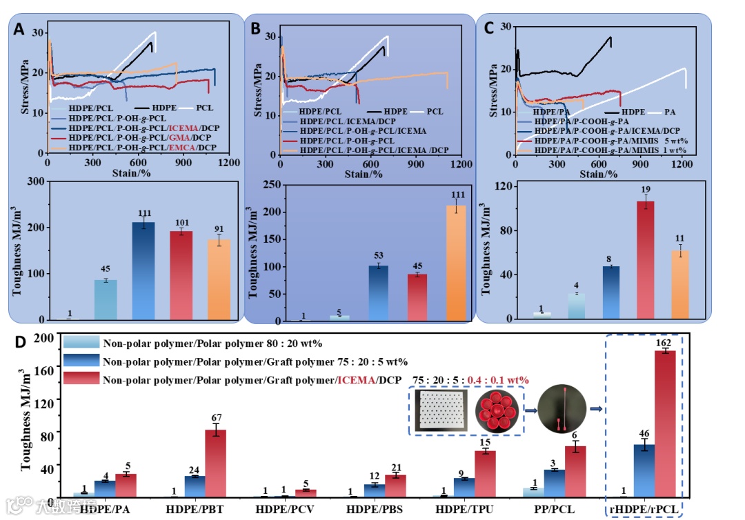 图3.接枝共聚物在各种混合塑料共混物中的增容性能。