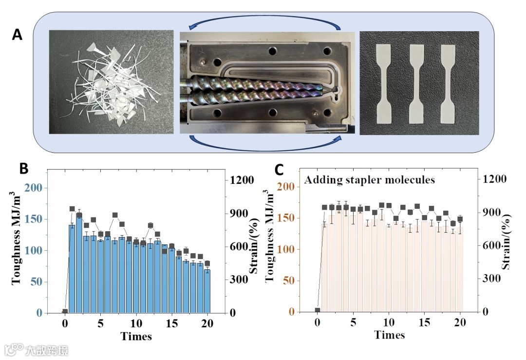 此外,作者认为塑料污染的根本问题在于“一次性”使用,多次回收再利用可以缓解这个问题。为此,探讨了订书机策略在混合塑料的重复加工和使用中的应用(图8),发现订书机策略可以是混合塑料在再加工20次后,拉伸强度和韧性也基本保持不变。总之,作者发展的一系列订书机策略为混合塑料的回收提供了有效的解决方案,探明了一条低能耗、低成本、高效率的混合塑料回收和升级利用之路。