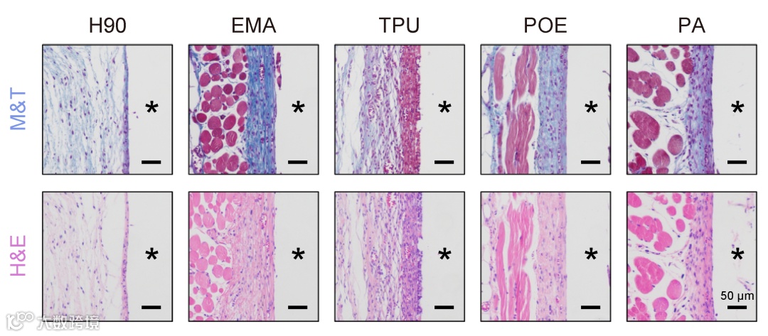 他们选择了三个样品 H50、H70 和 H90 ,进行进一步的体内植入测试,以评估它们的纤维化反应,并与常用医用弹性体 PDMS 进行比较。实验中,他们对 C57BL/6 小鼠进行了皮下植入,每只小鼠的背部植入了所有四个样品。经过一个月的植入期后,他们取出了弹性体片。代表性的照片和组织学图像见图2。组织学染色(包括 Masson 三色染色和苏木精-伊红 (H&E) 染色)显示,EVADE 材料(特别是 H90)形成了厚度为 10 至 40 微米的纤维化囊,而 PDMS 植入物的纤维化囊厚度则为 45-135 微米。我们还将 H90 与其他四种常用的生物医用可植入聚合物进行比较,分别是乙烯-甲基丙烯酸酯共聚物 (EMA)、热塑性聚氨酯(TPU)、聚烯烃弹性体 (POE) 和聚酰胺 (PA)。如图2所示,植入 H90 后几乎未形成任何纤维囊,而其他所有材料均形成了 35 至 160 微米厚的纤维化包膜。这表明 EVADE 材料具有优异的免疫相容性。
