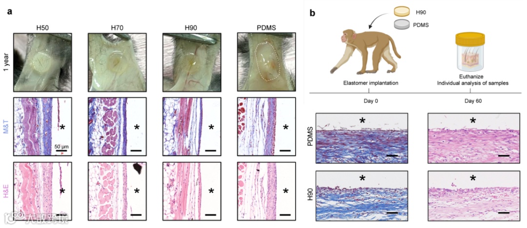 生物材料抵抗长期纤维囊形成的能力对维持体内植入装置的功能至关重要。为评估这一点,他们进行了为期一年的植入研究,并在十二个月后取回弹性体样品进行纤维化评估。所有 H90 弹性体样品均显示出清晰的轮廓,并被较薄的纤维囊包围,如数码照片和 M&T 染色所示(见图 5a)。相比之下,对照的 PDMS 弹性体在植入后形成了厚厚的胶原层,植入十二个月后完全被覆盖。为了将这些发现扩展到更高级的物种,他们在健康的食蟹猴皮下植入了 H90 和 PDMS 弹性体片(见图 5b)。两个月后取出植入物并进行分析。Masson 三色染色显示,PDMS 样品中存在显著的纤维化反应(最多 180 μm),而 H90 的胶原层较薄(最多 60 μm)。值得注意的是,在两只实验猴中没有观察到纤维化包裹现象。