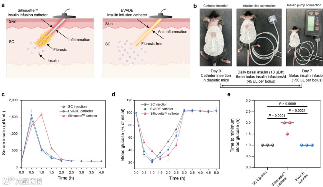 他们进一步开发了由 EVADE 材料制成的输注导管,并在糖尿病小鼠模型中评估了它们在标准泵治疗条件下的性能(见图 6)。EVADE 输注导管被植入小鼠皮下并用粘合剂固定,同时市售的 Silhouette 导管作为对照。为了测试 EVADE 导管在自然微运动下的表现,他们将导管连接到输注管线,并让小鼠携带输注器长达 7 天。随后,将导管连接到胰岛素泵(Medtronic MiniMed 722)以评估在持续胰岛素输注期间的功能。小鼠以 10 μL/h 的速率接受持续基础胰岛素输注,并每次进行 45 μL 的胰岛素推注(见图 6b)。植入后第 7 天,通过胰岛素泵进行了推注输注的胰岛素吸收试验。与标准皮下(SC)注射相比,通过 Silhouette 导管输送的胰岛素吸收延迟了 0.5-1 小时,而通过 EVADE 导管输送的胰岛素则表现出与 SC 注射一致的药代动力学特征(见图 6c-e)。因此,EVADE 输注器产生的血糖效应与传统的 SC 胰岛素注射相当,这通过给药后 1 小时的最低血糖水平得以体现。相对而言,Silhouette 输注器表现出明显的药理作用延迟,最低血糖水平比 EVADE 组晚 0.5-1 小时。这些发现凸显了 EVADE 材料通过减少局部免疫反应来改善植入式生物医学设备体内性能的潜力。