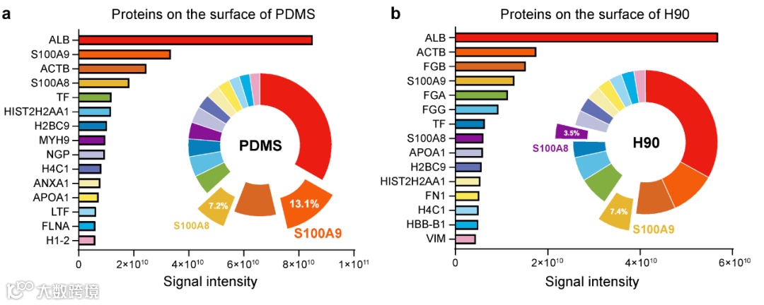 蛋白质吸附是异物反应过程中至关重要的初始步骤,研究植入物植入早期后表面蛋白质的吸附情况,有助于深入了解EVADE材料降低异物反应的机制。他们通过蛋白质组学鉴定了植入后24小时吸附在H90和PDMS表面的蛋白质种类(图3)。结果显示,在24小时内,白蛋白是 PDMS 和 H90 材料表面吸附量最大的蛋白质。在 PDMS 表面,炎症相关蛋白 S100A8 和 S100A9 的比例较高,分别为 7.2% 和 13.1%,而在 H90 表面的吸附量则显著较低,分别为 3.5% 和 7.4%。这些结果表明,S100A8/A9 蛋白的表达和吸附可能会加剧炎症反应,进而促进体内 FBR 的发生。