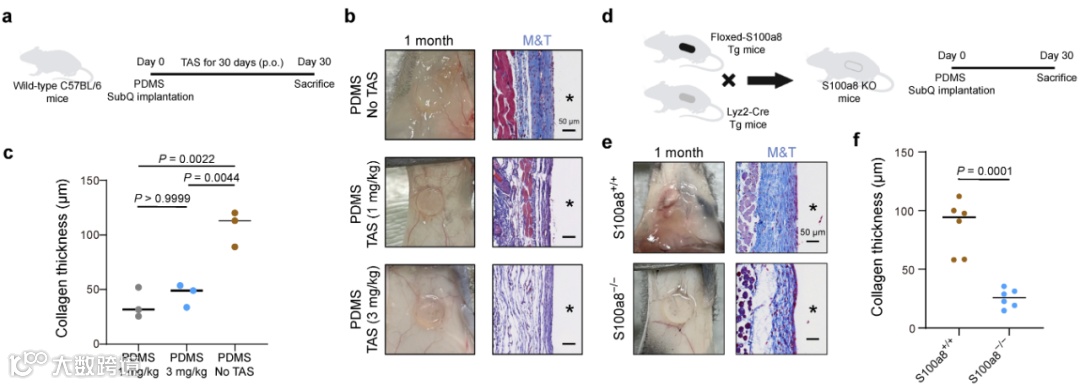 尽管大量研究支持 S100A8/A9 蛋白在炎症反应中的作用,但尚无直接证据表明抑制这些蛋白的表达可以减轻植入物的异物反应。基于结果,他们假设抑制 S100A8/A9 表达可能有助于降低植入物的异物反应。为验证这一假设,他们首先测试了S100A9 抑制剂 tasquinimod (TAS) 对 PDMS 片的纤维化反应。TAS 是一种口服活性喹啉-3-甲酰胺,具有与组蛋白去乙酰化酶 4 (HDAC4) 和 S100A9 高亲和力的结合。在 PDMS 植入后 30 天内,通过每日饮用水向小鼠提供两种剂量的 TAS(1 mg/kg 和 3 mg/kg)(见图 4a-c)。Masson 切片显示,TAS 组 PDMS 周围的胶原沉积明显减少,纤维囊厚度约为未施用 TAS 时观察到的 1/2 至 1/3 倍,表明PDMS片的异物反应得到抑制。此外,他们还构建了 S100A8 敲除 (KO) 小鼠模型,通过将 Floxed-S100A8 转基因 (Tg) 小鼠与 LysM-Cre Tg 小鼠杂交(见图 4d-f)。将 PDMS 圆盘植入皮下一个月后,组织学结果显示,S100A8 敲除的小鼠中几乎观察不到纤维化囊形成。综上所述,这些发现表明 S100A8/S100A9蛋白在材料植入后的纤维化过程中起着关键作用,降低这些蛋白的表达可以有效减轻材料诱导的异物反应。