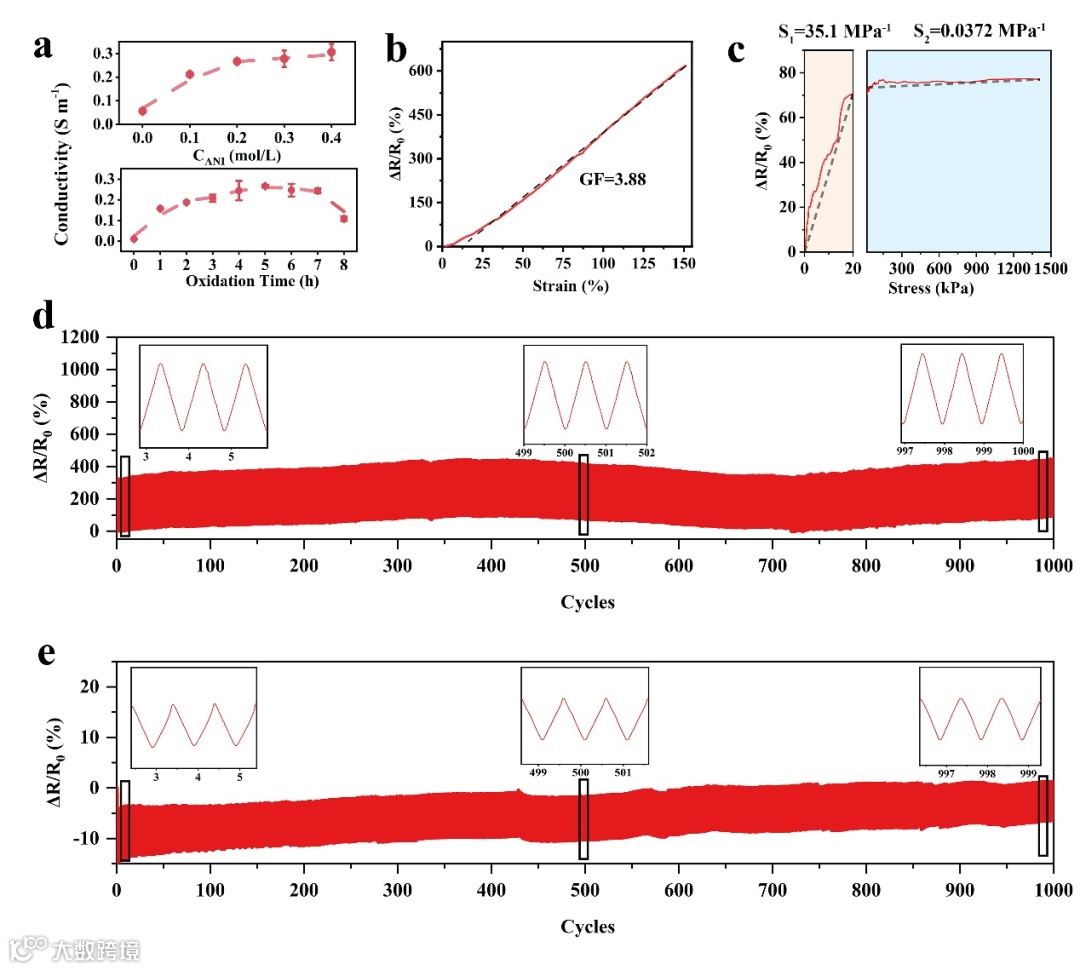 聚苯胺链贯穿于凝胶网络中,赋予凝胶较高的导电能力,电导率可达0.27 S/m (图2a)。在拉伸变形过程中,聚苯胺链滑移,凝胶的电导率/电阻率发生变化,在较宽的应变范围内呈线性传感特性(图2b)。在压力作用下,凝胶在低应力区呈现高灵敏度(35.1 MPa-1),在高应力下呈现低灵敏度(图2c)。重要的是,在循环加载中,由于凝胶的导电网络结构保存完好,其低迟滞特性也赋予凝胶基传感器优异的传感鲁棒性。在1000次循环拉伸(100%应变,图2d)和压缩(20%应变,图2e)测试中,传感信号呈高线性度,且不衰减或漂移。
