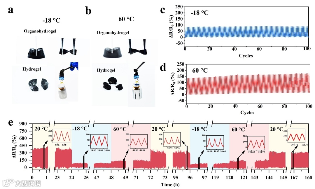 图3 有机水凝胶在高低温环境中保持优异的柔性和传感鲁棒性。