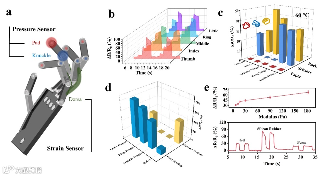 基于上述研究结果,该团队结合线性回归的机器学习模型实现了仿生机器触觉,用于辅助“识别”机械手抓握物体的形状。首先,在机械手背安装应变传感器阵列,通过五通道分别采集各手指的运动状况(图5a)。以球、圆锥和长方体等规则形状的物体为研究和训练模型,采集机械手在抓取物体时的传感信号,并与相应的手势建立对应关系,通过抓握时的手势反映物体的形状,用于训练线性回归模型(图5b)。经大量测试数据训练后,线性回归模型可识别机械手所抓握物体的形状(图5c)。在15000次的物体抓握模拟中,模型对球、圆锥和长方体的识别准确率均为100%(图5d)。