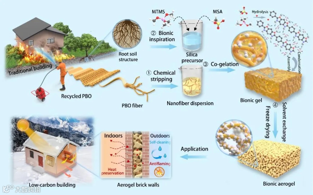图1. 合成仿生气凝胶BNFSi的共凝胶方法及其在建筑中的多功能应用示意图