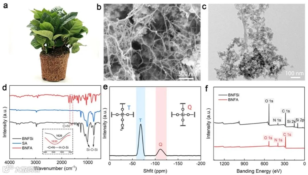 研究结果表明,PBO纤维形成了微米级和纳米级的纤维结构,构建出多尺度结构,有助于形成类似于植物发达根系的多分支网络(有利于0D硅球,1D纳米纤维结构单元结合升级成2D纤维网络包覆结构,从而形成3D整体)。PBO纳米纤维(BNF)因其丰富的比表面积(SSA)和可调节的表面特性,在微纳米级设计中发挥了关键作用,从而推动了块体复合材料的发展和先进纳米材料的形成。通过将硅溶胶作为“土壤”基质,水解缩合反应能够精确控制PBO分散体对质子的吸收,最终形成的缩合产物结构与植物根土结构高度相似(图2)。