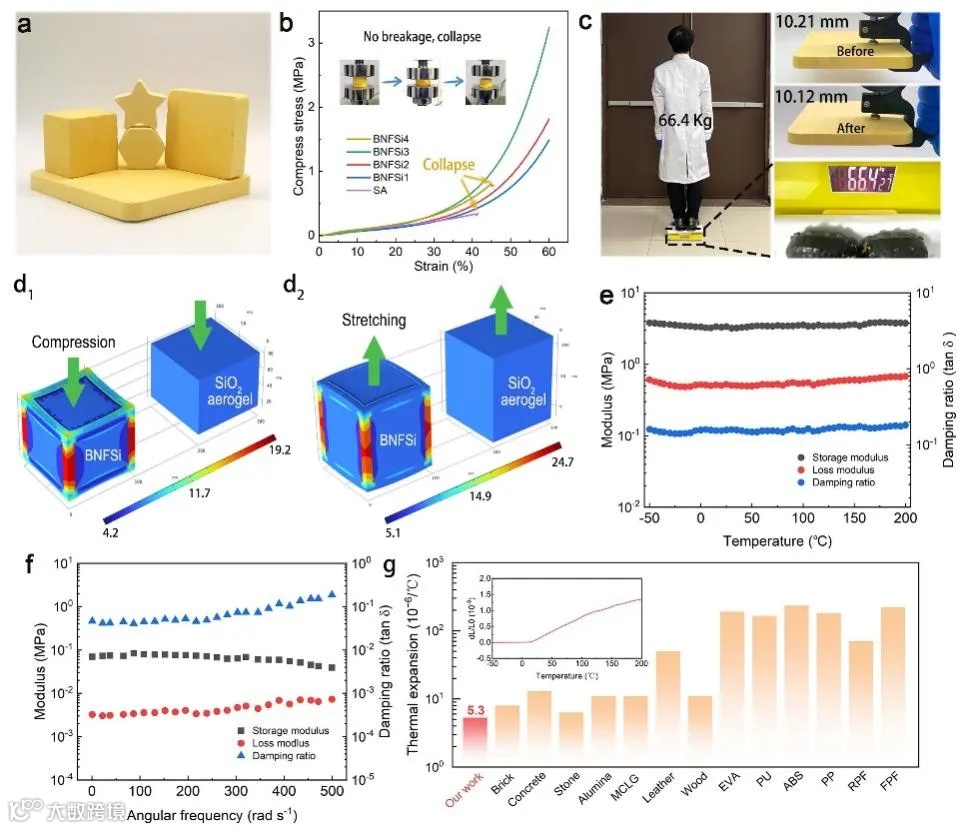 所制备的BNFSi气凝胶具有优异的成型性(图3),能够塑造成多种形状,并可通过减材制造进行加工,以适应特定场景的形状需求。升维策略显著提升了BNFSi的压缩强度,使其达到3.2 MPa,是原始二氧化硅气凝胶的6倍以上,同时具备增韧效果。即使人站立其上,气凝胶也不会发生坍塌或结构破坏,力学模拟进一步证明了PBO在增强气凝胶力学性能方面起到了积极作用。