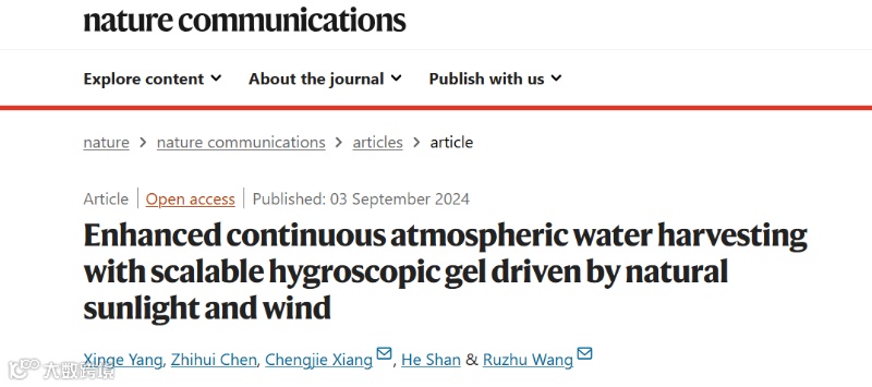 近日,上海交大机械与动力工程学院制冷与低温工程研究所王如竹教授领衔的ITEWA团队在Nature Communications上发表题为Enhanced continuous atmospheric water harvesting with scalable hygroscopic gel driven by natural sunlight and wind的论文,针对目前吸附式空气取水领域吸附剂吸附动力学缓慢和装置冷凝效率低两大技术难点,提出具有低传质阻力的互连多孔吸湿凝胶的可放大合成策略以及通过聚光提高解吸温度实现能效升级。该论文第一作者为制冷与低温工程研究所博士生杨辛格,王如竹教授和香承杰博士后为通讯作者。