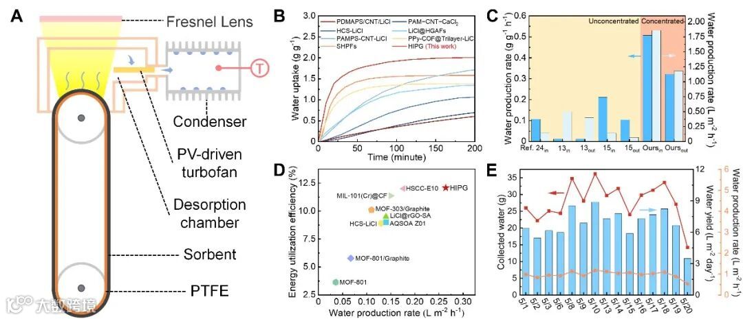 图 (A) 光-风联合驱动的连续式空气取水装置示意图 (B) 材料吸附性能比较 (C) 装置取水性能比较 (D) 装置产水速率及能量利用效率比较(1 sun) (E) 装置户外完整日间取水性能测试