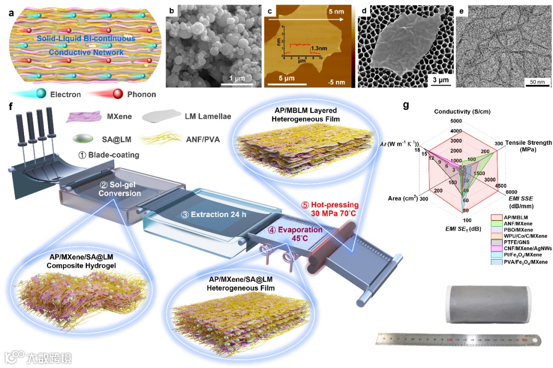 通过将MXene纳米片和包覆有海藻酸钠的液态金属(SA-LM)纳米乳液在二甲基亚砜(DMSO)中形成稳定分散液,之后将其与芳纶纳米纤维和聚乙烯醇在DMSO中的分散液共混,形成前驱体溶液。之后,通过溶胶—凝胶—成膜转化以及热压工艺形成AP/MBLM异质层状纳米复合薄膜。MXene纳米片与液态金属片层相互桥连并对其限域,构建了稳定的固—液双连续导电导热网络,赋予材料良好的电磁屏蔽与散热性能。