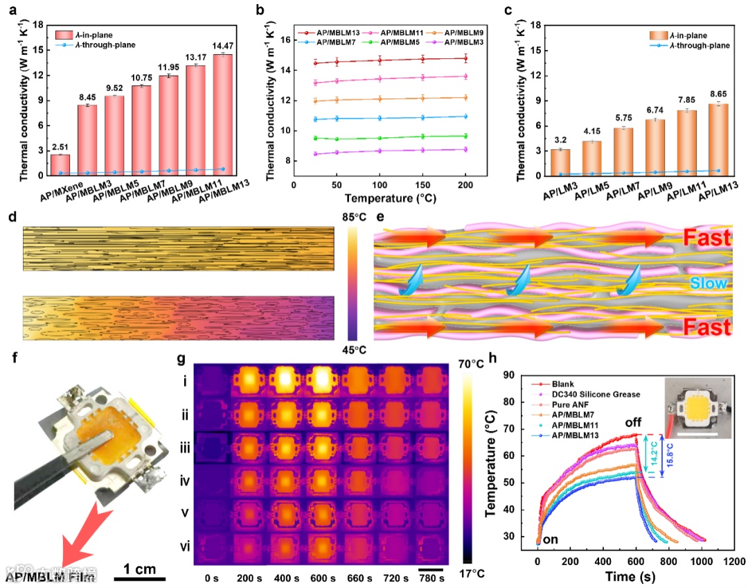 通过调控液态金属的含量,AP/MBLM纳米复合薄膜的面内热导率最高可达14.47 W/m·K,并展现出显著的热导率各向异性,这对于精密电子设备的高效热管理具有重要意义。这种各向异性源于材料内部的层状异质固-液双连续导热网络。将该薄膜与LED灯芯集成后,展现出优异的散热能力,使灯芯中心温度最大降低15.8℃,有效提高了设备的热管理效率和运行稳定性。
