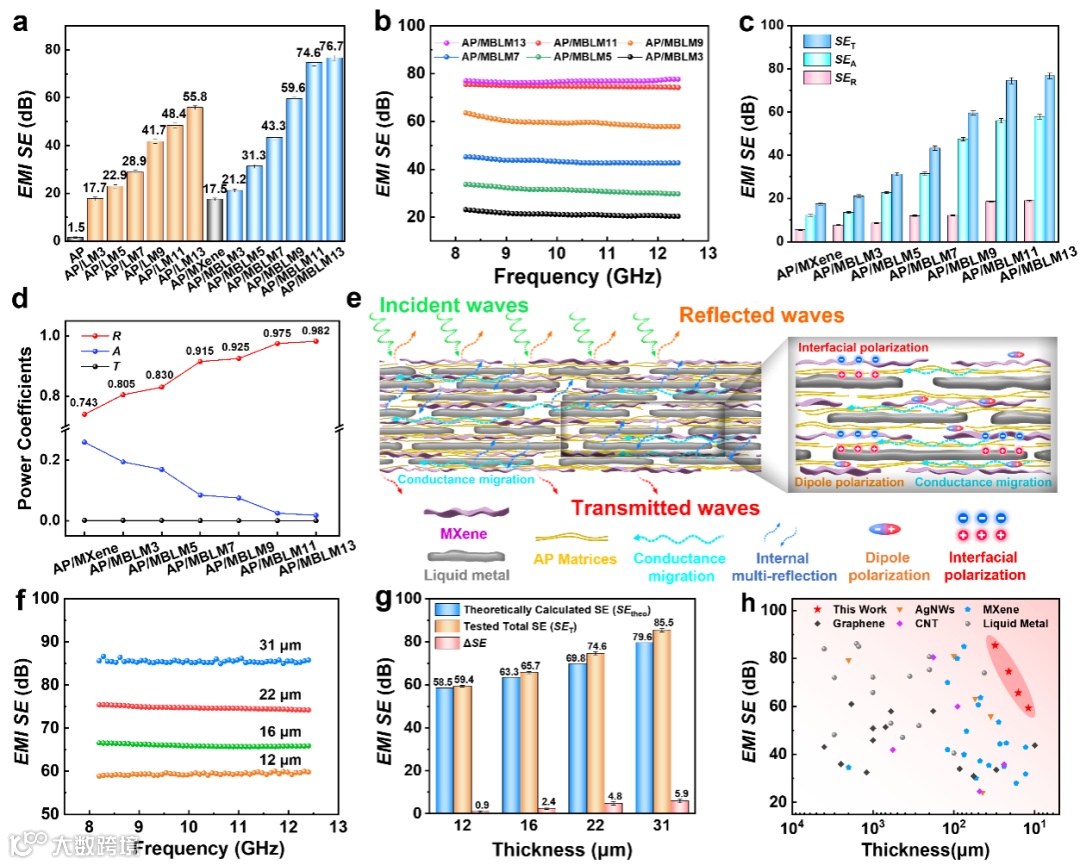 通过调整AP/MBLM纳米复合材料中液态金属和MXene的配比,可以有效调控其电磁屏蔽性能。AP/MBLM11复合薄膜在22微米厚度下实现了约74.6 dB的超高电磁屏蔽效能。由于材料具有极高的电导率,其主要屏蔽机制是反射。此外,材料内部的多重异质界面导致了电磁波的多重反射、界面极化和偶极极化等效应,进一步增强了电磁波的损耗。实验结果与理论计算值的对比证实了这些效应对电磁屏蔽性能的提升。AP/MBLM纳米复合材料在电磁屏蔽效能方面相较于近年来报道的其他电磁屏蔽材料具有显著优势。