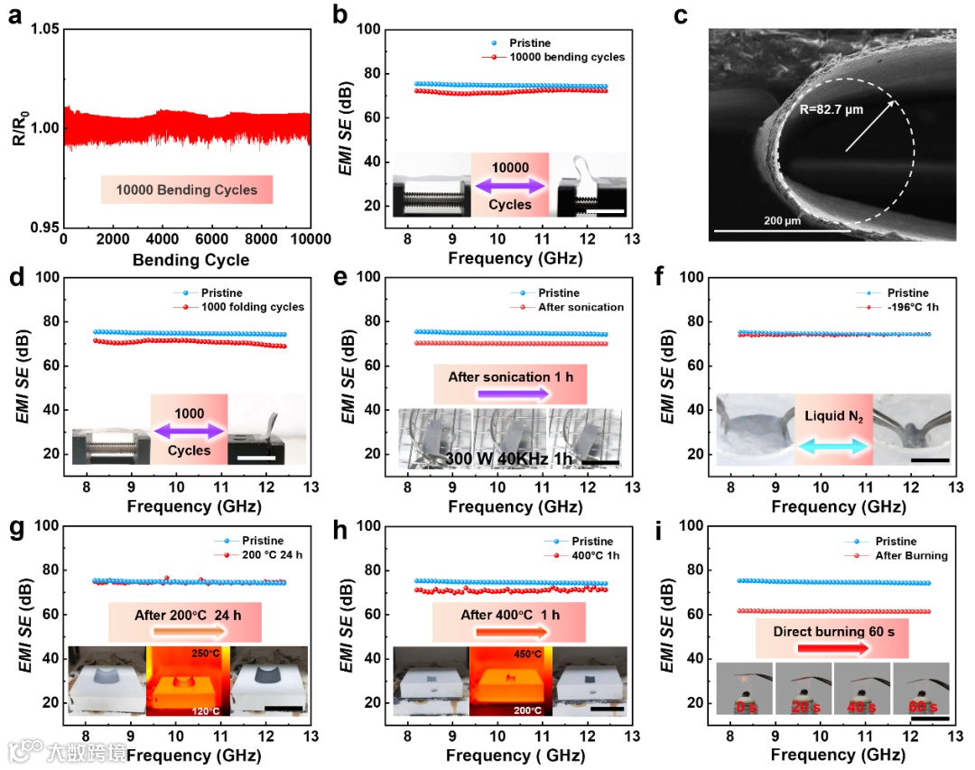 AP/MBLM纳米复合薄膜具备极佳的柔韧性,其电磁屏蔽效率在经受1万次弯曲和1千次弯折后其电磁屏蔽效能均保持在70 dB以上。此外,在抵抗300 W功率超声1小时后其电磁屏蔽效率稳定在70 dB。而对于各种严苛温度环境,该材料在液氮中浸泡1小时以及在200℃及400℃分别热处理24小时和1小时后,其电磁屏蔽效能保持在70 dB以上。该材料甚至还表现出良好的耐烧蚀能力,在酒精灯外焰直接烧蚀1分钟后,其电磁屏蔽效能依然能维持在60dB。