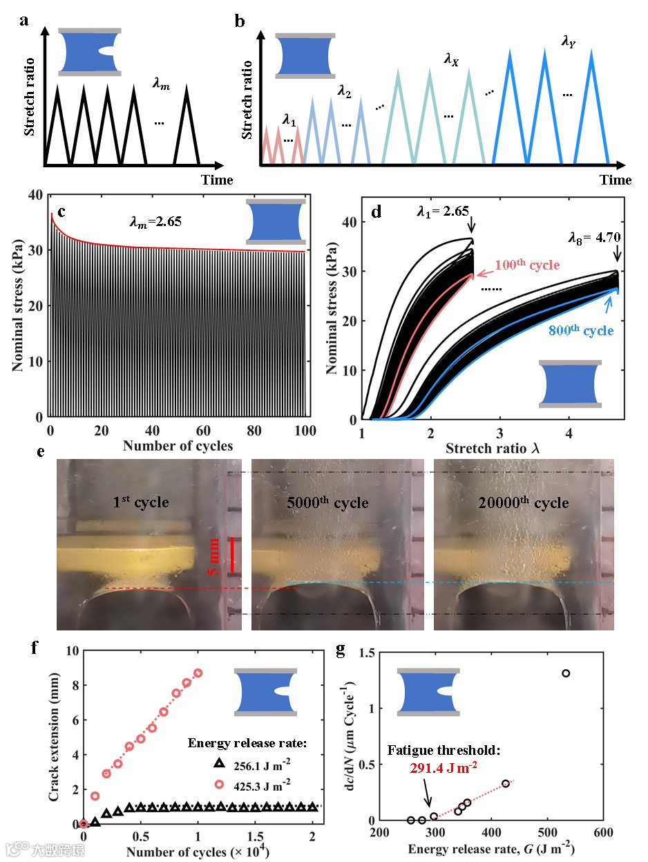 Lake-Thomas模型表明,水凝胶的疲劳阈值与分子链长的1/2次方呈正比,因此增加分子链长度有利于提升水凝胶的抗疲劳性能。此外,在循环载荷作用下,裂纹的扩展需要破坏裂尖平面内的一层分子链,因而增加分子链密度也能提升疲劳阈值。在当前策略中,低交联导致的长链结构与脱水导致的分子链密度提升协同作用,大幅提高了水凝胶的疲劳阈值,达到近300 J m-2。与普通PAAm水凝胶(约10 J m-2)相比,采用该策略所设计的水凝胶具有更为优异的抗疲劳性能。