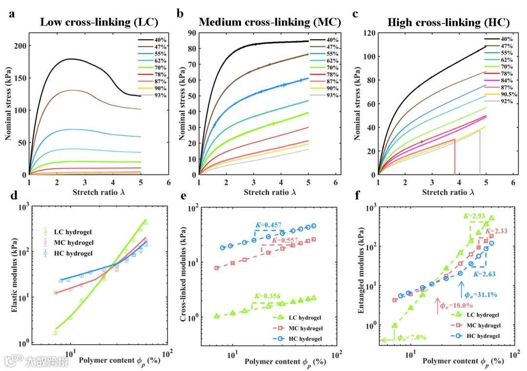 图4. 不同交联程度、不同当前含水量水凝胶的准静态应力-拉伸比曲线与模量