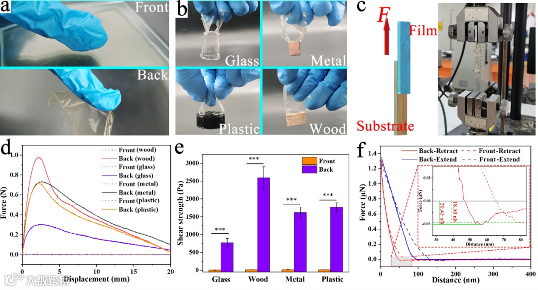 图3. 不对称粘附性能:a) CAZ 的正面以及背面的粘附行为;b) CAZ 背面对不同材料的粘附特性;c) 剪切粘附测试示意图;d) 剪切粘附力曲线;e) CAZ 的正面以及背面对不同材料的粘附剪切强度;f) CAZ (烘干样品) 的正面与背面的AFM测试力曲线。
