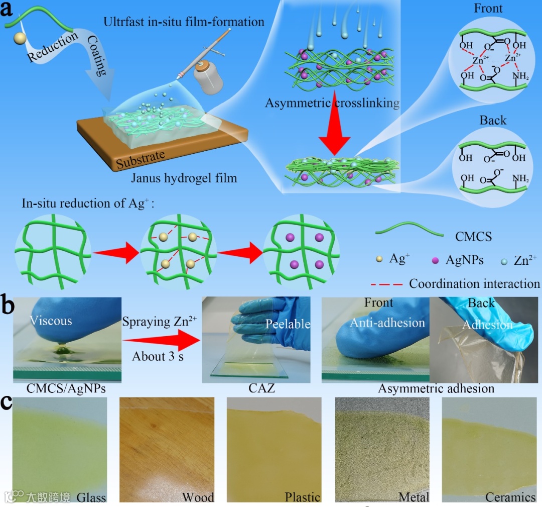 图1. Janus 凝胶膜 (CAZ) 的制备: a) 不对称交联构建Janus 凝胶膜示意图; b) CMCS/AgNPs, CAZ以及不对称粘附特性图片; c) 在不同材料表面制备的CAZ.