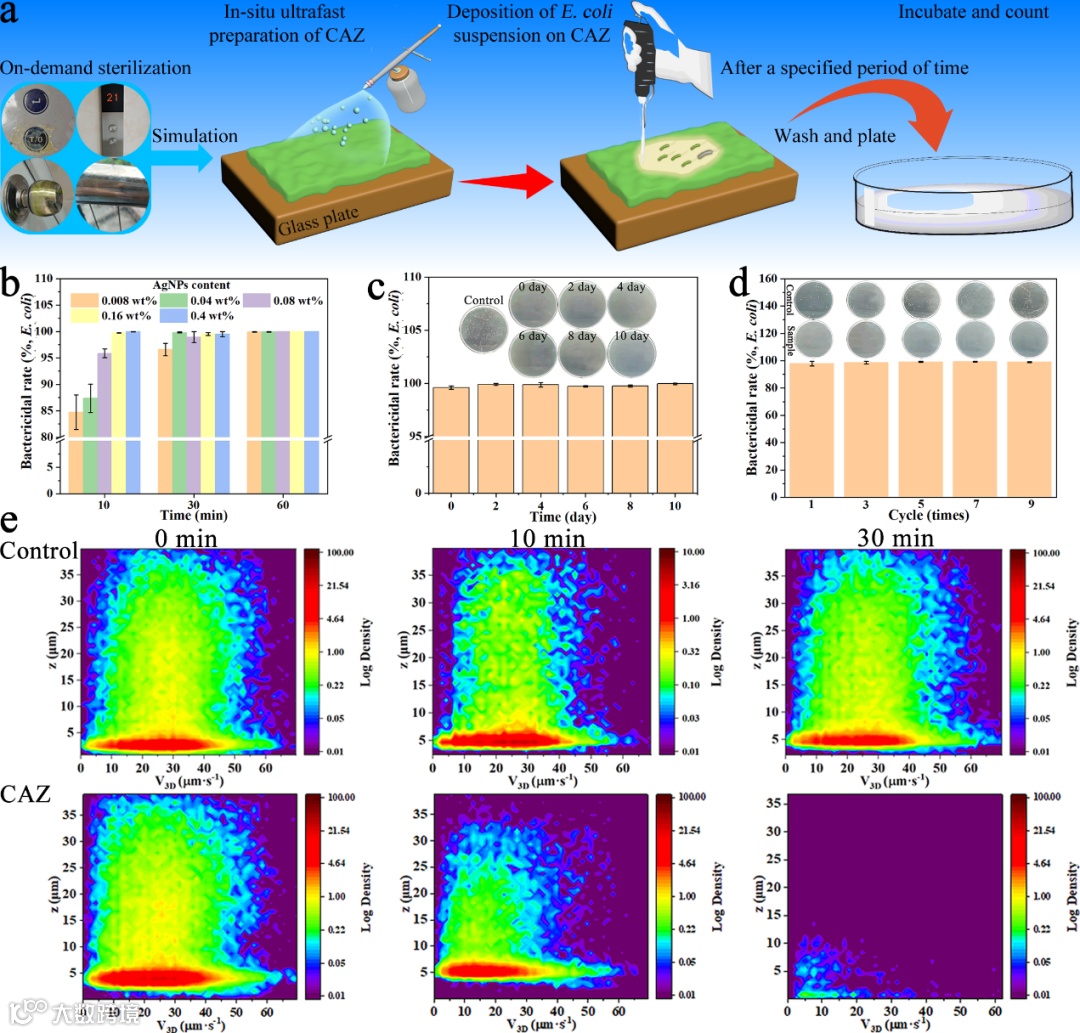 图4. CAZ的接触杀菌性能:a) 接触杀菌实验示意图;b) 含有不同AgNPs 含量的CAZ 与细菌在不同接触时间的杀菌率;c) 放置不同时间的CAZ的接触杀菌率;d) 重复多次感染的CAZ接触杀菌率;e) 细菌在对照组以及CAZ膜表面的不同接触时间时的密度分布 (z: 细菌与膜的垂直距离,V3D: 瞬时三维速率)。