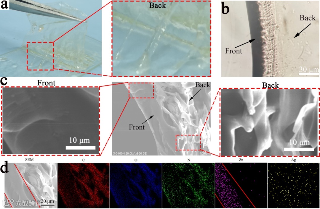 图2. CAZ的不对称结构:a) CAZ背面照片; b) CAZ 横截面光学显微图片;CAZ (冻干)的不对称结构SEM图;d) CAZ断裂面的EDS元素分布图。